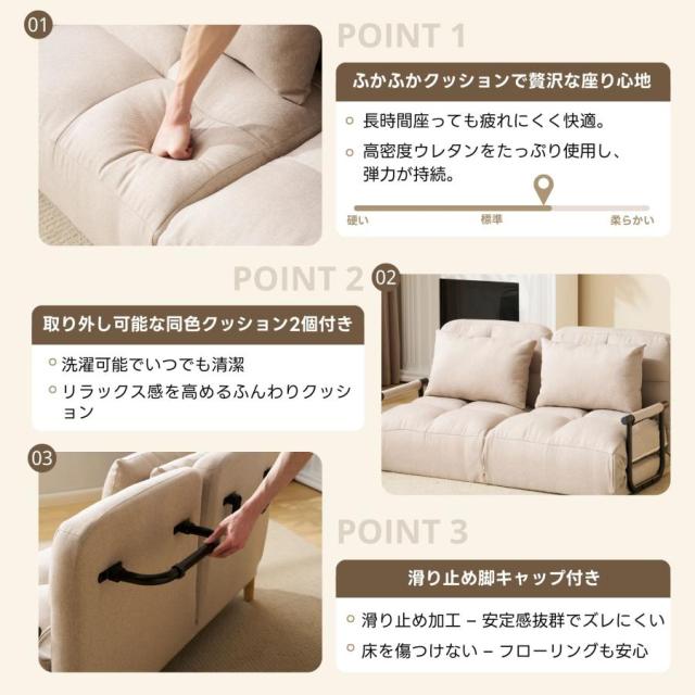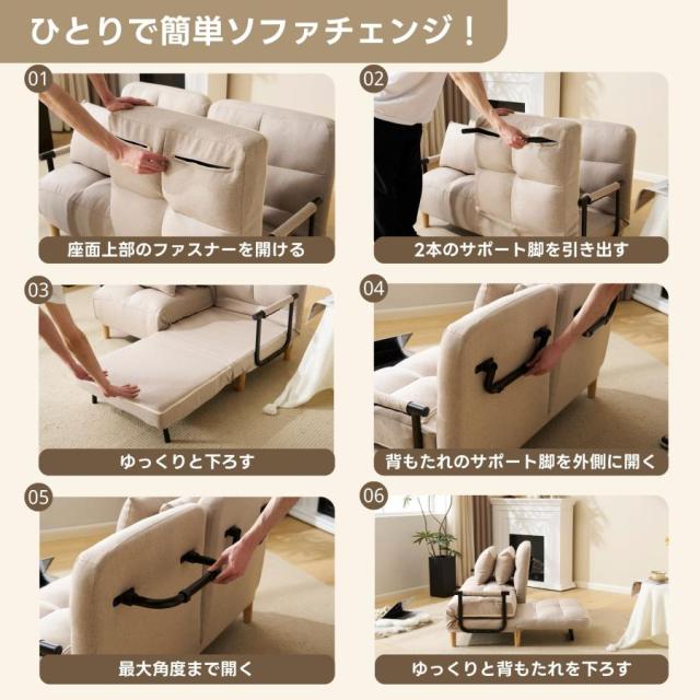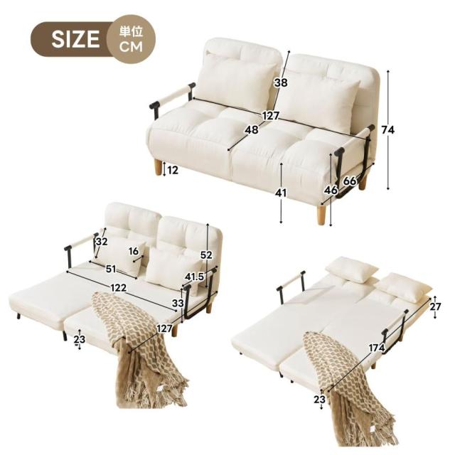 【一台四役】ソファとしては、長時間の読書や映画鑑賞でも疲れにくく快適な座り心地で、そして左右は独立で調整可能なので、カウチおよびソファ、自分の好みによってスタイルを選んでください。そしてベッドとしては幅122*174cmのサイズは広く、快適に休めいただけるように安心感を提供します。