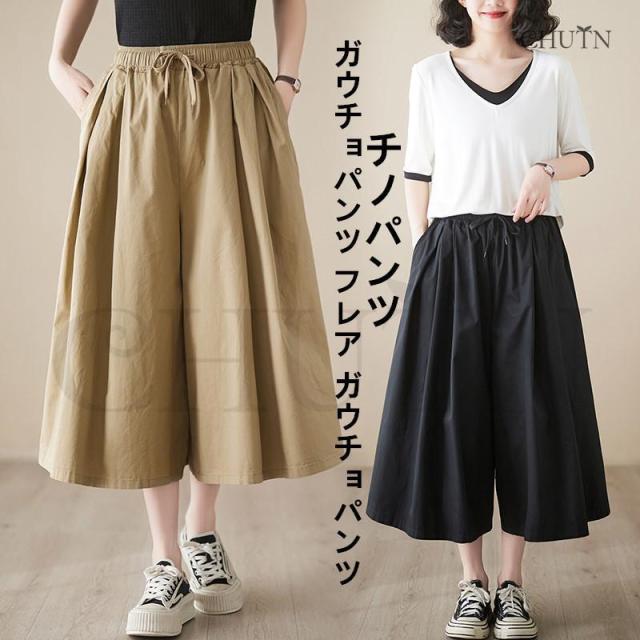 サマーマキシチノパンツガウチョパンツ 涼しい ワイドパンツ夏 ガウチョパンツ ボトムス ゆったり フレアパンツ ロング丈 ウエストゴム カジュアル ズボン