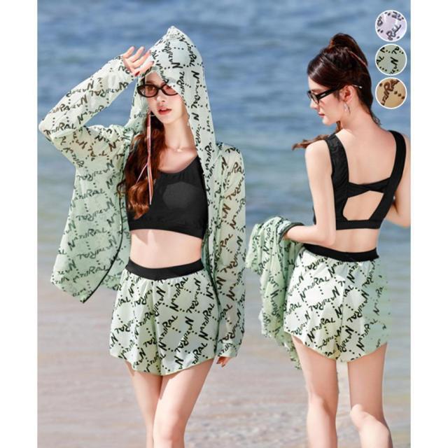 控えめ 水着3点セット 大人可愛い スイムウエア 英字柄 セパレート水着 日焼け防止 ラッシュガード付き 体型カバー