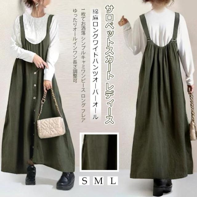 サロペットスカート40代 綿麻ワンピース50代 ジャンパースカート 綿麻 サロペット 夏秋冬 キャミワンピース ロング フレア ゆったり オールインワン