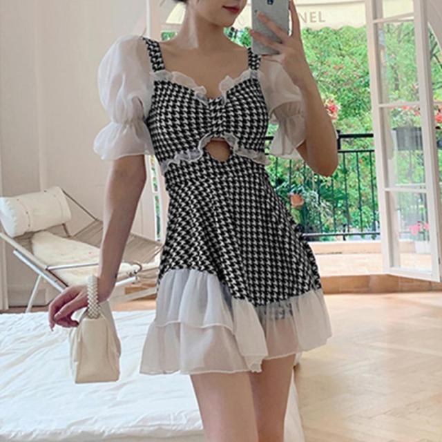 ワンピース 春水着 夏 千鳥柄 韓国スイムウェア