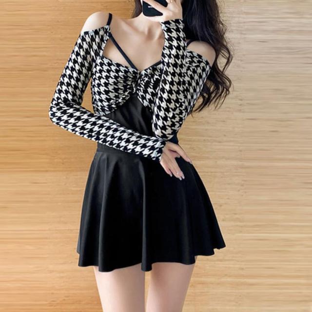 千鳥柄と無地の切り替えがクラシカルなワンピースの水着セット