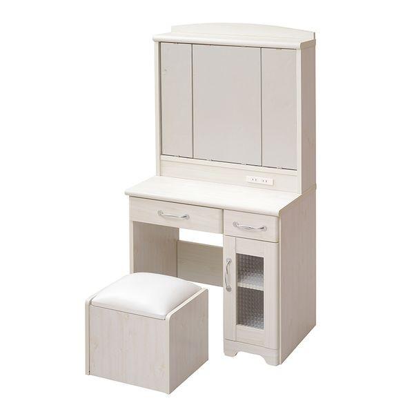 ●商品説明スタンダードなカラーでシンプルな三面鏡ドレッサー。お得なセットのスツールは座面の中に収納可能なスペース付。広めの引出しと、小さめの引出し、背の高いものも収納できるガラス扉収納スペースもあり、ミラーの裏側にも収納できるので、メイクアップに必要なものを大量収納できます。2口コンセント付きなので、ドライヤーやヘアアイロンもドレッサー周りでご使用いただけます。