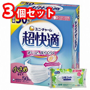 【今ならシルコットウェットプレゼント】3個セット ユニ・チャーム 超快適マスク プリーツタイプ 小さめ50枚入