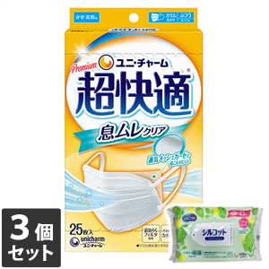 【今ならシルコットウェットプレゼント】3個セット ユニ・チャーム 超快適マスク 息ムレクリアタイプ ふつう 25枚入 4903111528158