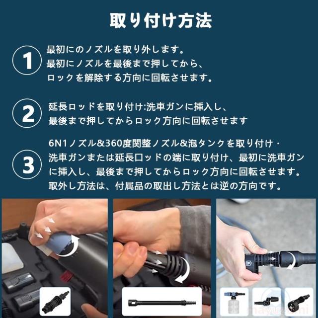 ★お届け内容:洗車高圧ガン本体x1、収納ケースx1、角度切替可の6in1多機能マルチノズルx1、バブルボトル用ノズル*1、大容量バッテリー(別購入)、フィルタx1、給水ホースx1、ホースリテーナx1、充電アダプターx1(別購入)。