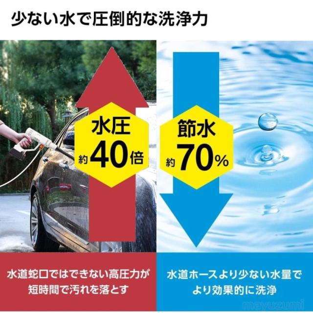 ポータブル洗車機のため、高圧水洗機は庭の散水や植木の水やり、打ち水などに便利です。マンションなどのベランダと窓はもちろん、車、バイク、自動車、自転車などの洗車機器、年末など定期掃除、BBQなどキャンプ用品の掃除、 庭の植木散水、お風呂や室内汚れの掃除、農産物の泥洗浄、塩害や台風後など大面積の地面掃除など場合におすすめます。