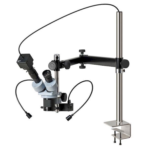 ●1× / 2×切換式対物レンズのコンパクトな実体顕微鏡と、堅牢で取付ネジを多数備えた500万画素USBカメラのセットです。