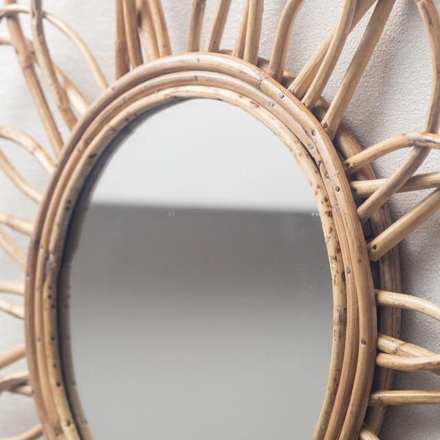 ラタンを丁寧に編み込まれて作られたお洒落で可愛いウォールミラーです。素材の温もりを感じるどこか懐かしいデザインで、置いておくだけでもインテリアのアクセントになります。使えば使うほどに味わいが増し、ラタンならではの経年変化もお楽しみいただけます。