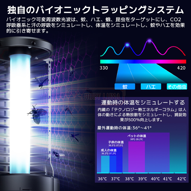 | 【光で誘引・電気で撃退】 | ◆虫が寄ってきやすいとされる波長のUVライトを利用し虫を誘引。 ◆寄ってきた虫が内側の金属棒に触れると感電して殺虫! ◆殺虫剤やスプレーを使用せず駆除できるので、無害かつ環境にも優しい商品で、ペットやお子様がいるご家庭にもおすすめです。 |