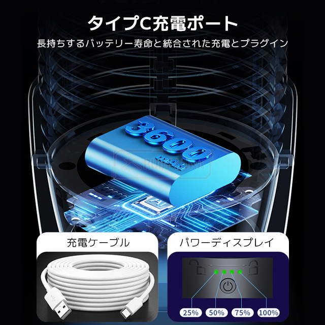 | 【充電式】 | ◆充電式なので、コンセントから離れた位置での使用や、屋外での使用にも適しています。 ◆また、2メートルの長さのロングな充電コードも付属いたしますので、充電が少ないときはコードを挿したままお使いいただけます。 ※電源アダプターは付属しておりませんので別途ご用意ください。 |
