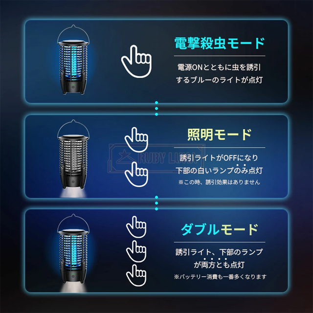 | 【モードについて】 | ◆製品の電源ボタンを押すと、 電撃殺虫モード ↓ 照明モード ↓ 電撃殺虫+照明モード ↓ 電源OFFの順番で切り替わります。 照明モードは誘引効果はなく辺りを照らすランタンとして使用できるモードです。 |