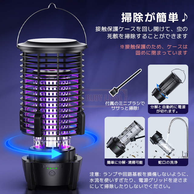 | 【掃除が簡単】 | ◆接触保護ケースをカチッと回し開けて、虫の死骸を取り除くことができます。 ◆付属のミニブラシで掃いて掃除または水洗いで掃除が可能です。 ◆水洗いを行う際は電気回路に水が付かないように機器を逆さまにして、水の勢いを弱めて注意して行ってください。 |