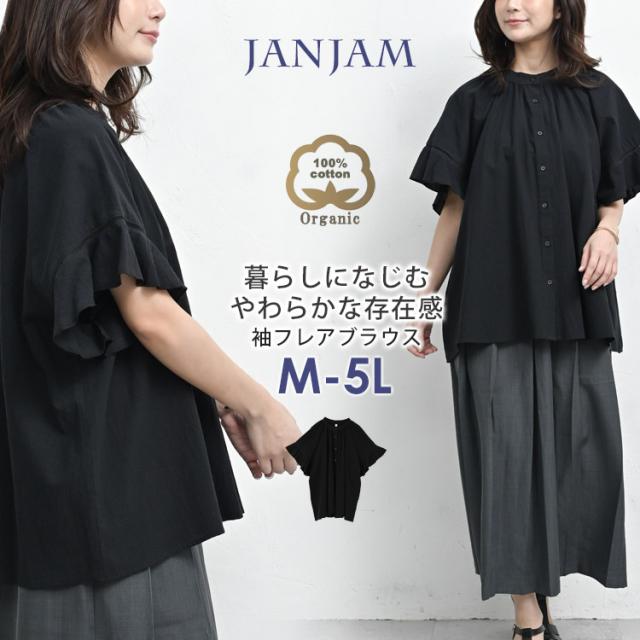 大きいサイズ レディース 袖フレアブラウス メール便対応 5分袖 前開きボタン オーガニックコットン シャツ トップス cotton100 M/LL/3L/4L/5L ゆったりサイズ ぽっちゃり女子 プラスサイズ
