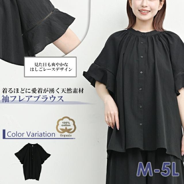 【メール便対応】優しく肌に寄り添う天然コットン素材フレア袖ブラウス。 XXXXL 2XL 3XL 4XL 5分袖トップス ゆったりサイズ ぽっちゃり女子 プラスサイズ 大きいサイズ レディース 5分袖トップス 5分袖ブラウス 5分袖チュニック フレアスリーブ レース切替 ハシゴレース 5分袖 五分袖 フリル袖 バンドカラー マオカラー 前開きボタン フロントボタン 無地 春服 夏服 春物 夏物 春トップス 夏トップス cotton100 オーガニックコットン100% サステナブル 体型カバー ゆったり 大きめ 大人 カジュアル フェミニン ナチュラル 大人可愛い きれいめ かわいい 着こなし おしゃれ 定番 春コーデ 夏コーデ ファッション 大きめ 女性 婦人用 ミセス 30代 40代 50代 2025 夏新作 春 夏 黒 M LL 3L 4L 5L 9号 13号 15号 17号 19号 cp-ss-tp0539
