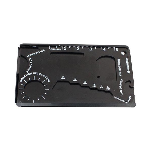 薄くて頑丈な14機能の万能ツール。アルミケース付。ボックスオープナー・レターオープナー・ルーラー(5mm)・蝶ねじレンチ・栓抜き・キーチェーンホール・ドライバー(4種類)・缶切り・フルーツピーラー・六角レンチ(6サイズ)・角度ゲージ。ストラップ付。