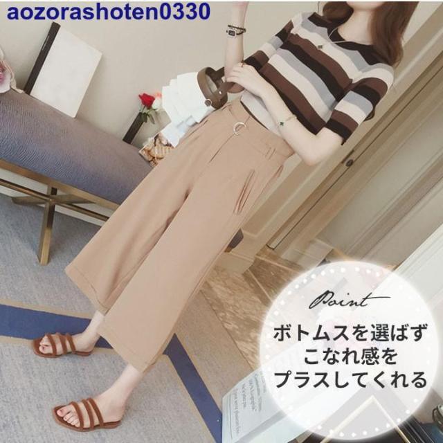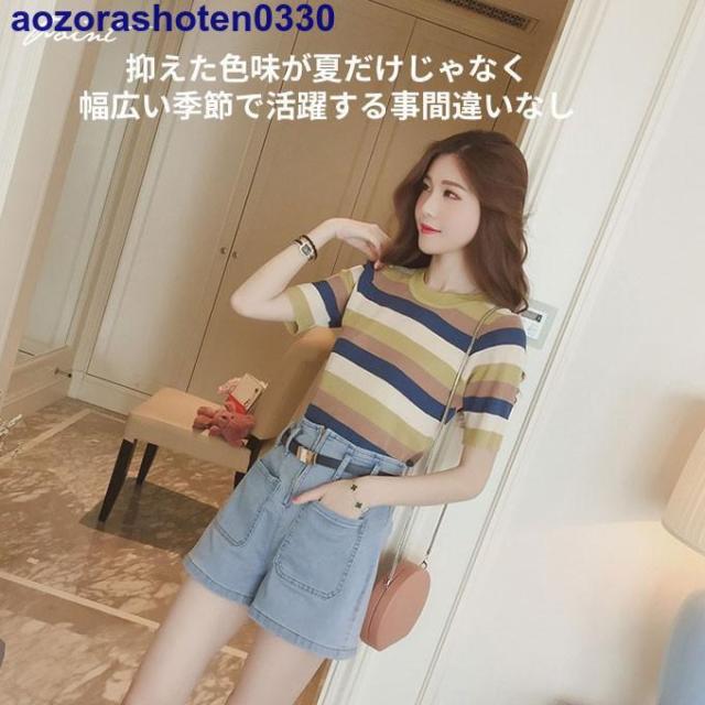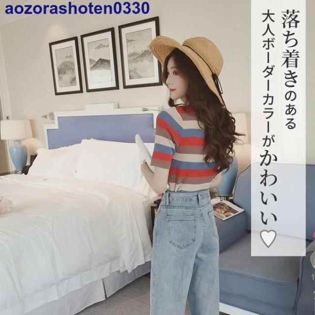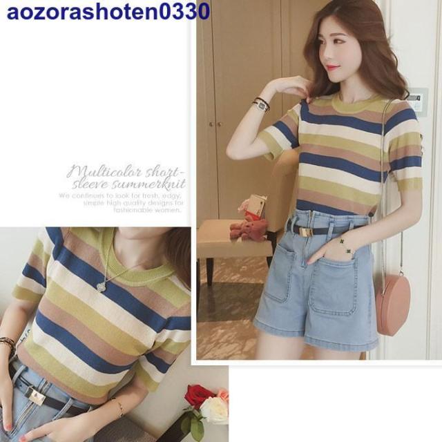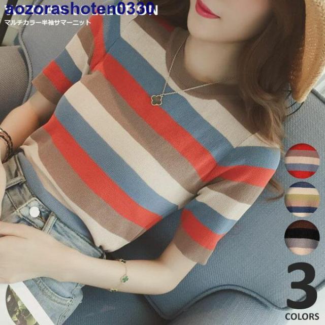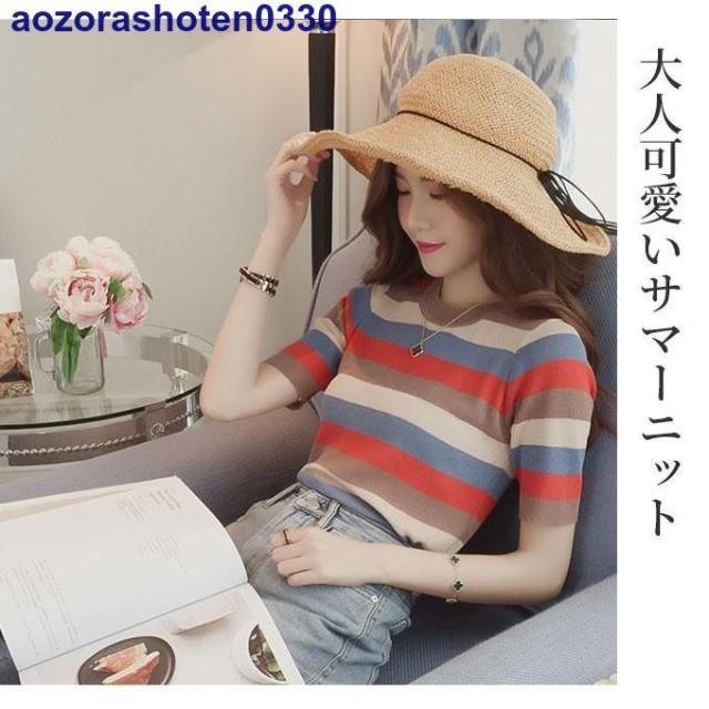 サマーニット 半袖 トップス ニット生地 レディース マルチカラー 夏 トップス カットソー Uネック ボーダー 可愛い おしゃれ