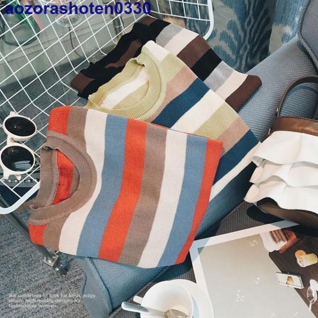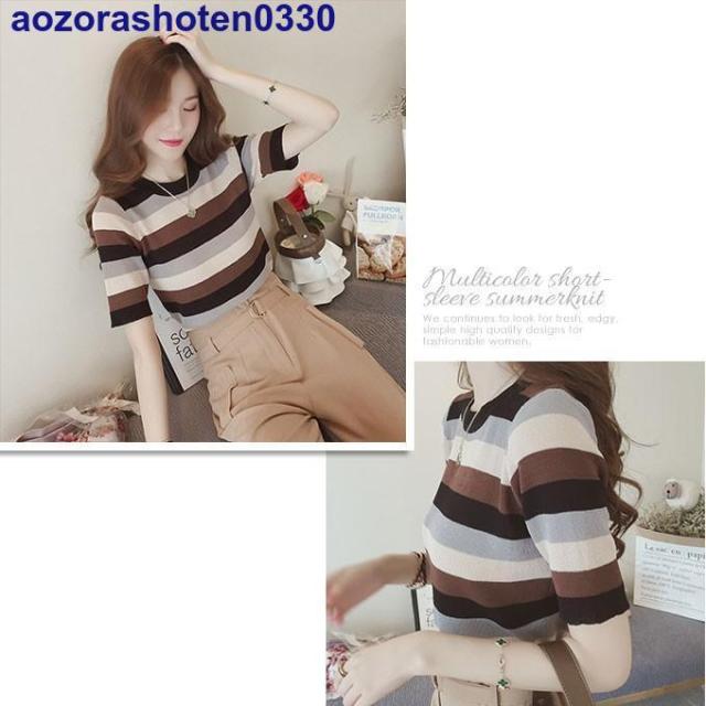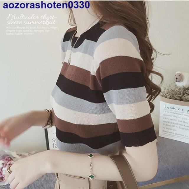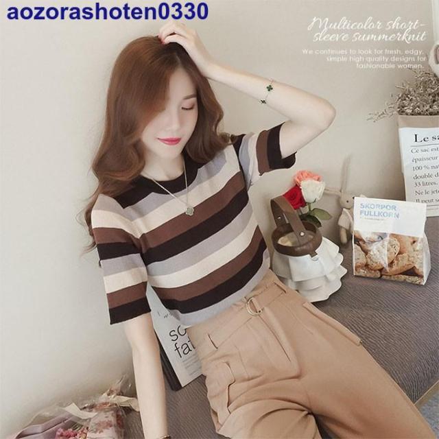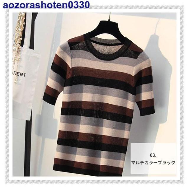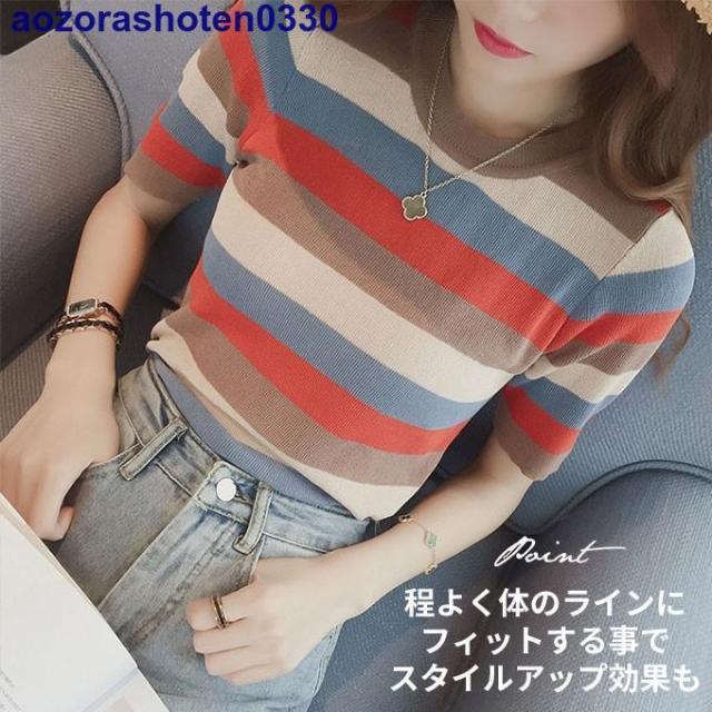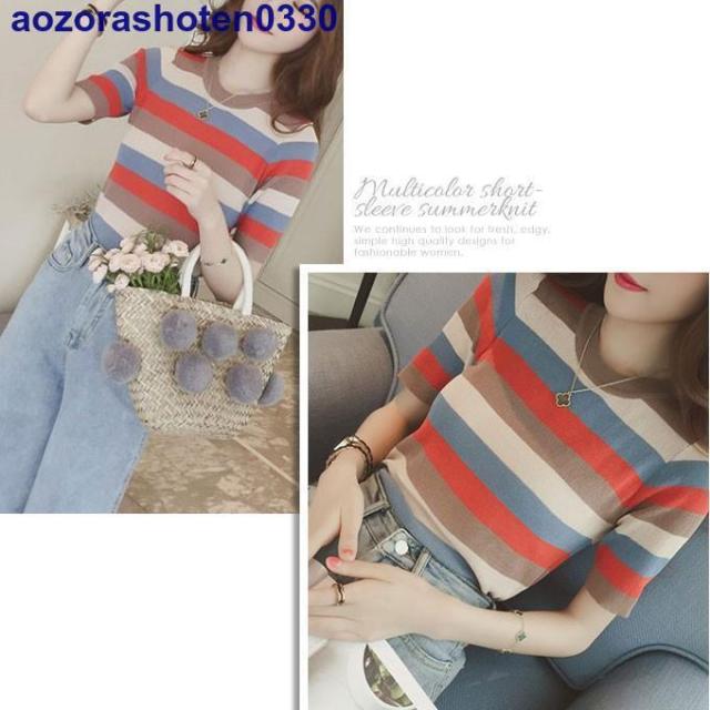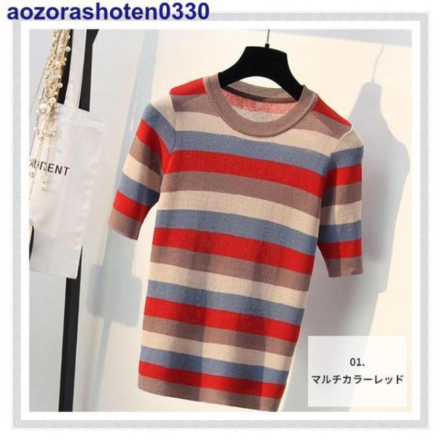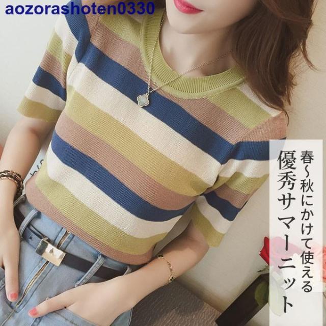 サマーニット 半袖 トップス ニット生地 レディース マルチカラー 夏 トップス カットソー Uネック ボーダー 可愛い