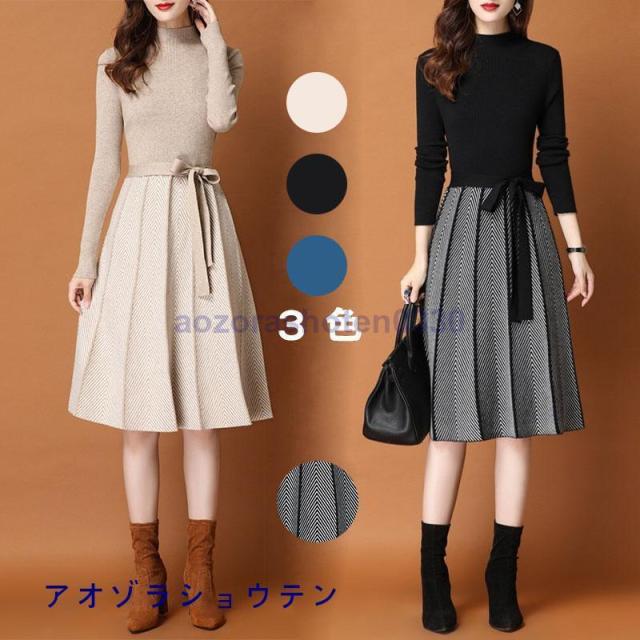 ニットワンピース レディース 40代 秋冬 オシャレ 膝丈ワンピース 長袖 リボン Aラインプリーツスカート 結婚式ドレス 大人可愛い 二次会 入学式
