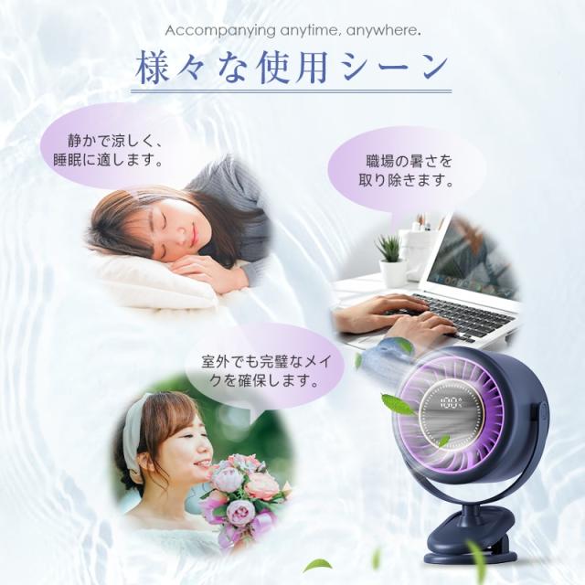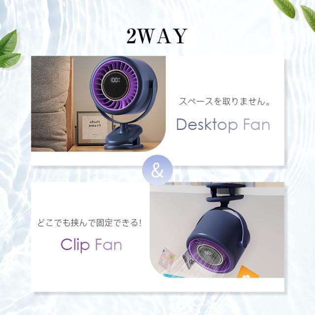 クリップ式なので、デスクの端や棚などにも簡単に取り付け可能。さらに、据え置きもできる2WAY使用が可能。スペースを無駄にせず、場所を選ばず涼しさを提供します。リビングやオフィス、寝室はもちろん、充電式でコードレスのため、アウトドアやキャンプでも大活躍します。