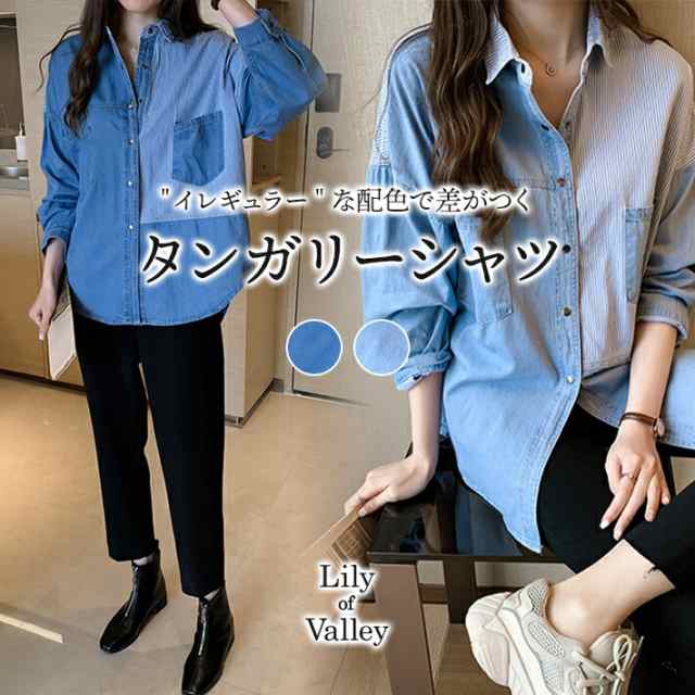 イレギュラーな配色が目を惹く♪ストライプ 切り替え ビッグ シルエット タンガリー シャツ/上品 ドロップショルダー ボリュームスリーブ 襟付き デニム ゆったり 大人可愛い 春夏