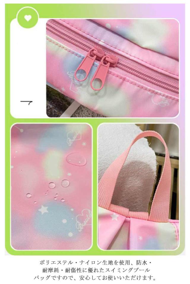 | 手軽にお使いいただけるレディース乾湿分離式プールバッグ 柄模様豊富で、色鮮やかなとってもオシャレな防水バッグです♪ 防水ポケット付きで濡れたものと乾いたものを分離して収納できる、乾湿分離式の高機能トプールバッグです。 底部分には靴収納が可能な大型立体ポケットがあります。 ポリエステル・ナイロン生地を使用、防水・耐摩耗・耐傷性に優れたスイミングプールバッグですので、安心してお使いいただけます。 海やプール、ジム、スポーツ、温泉、旅行など、様々な場面でご利用いただけます! | |