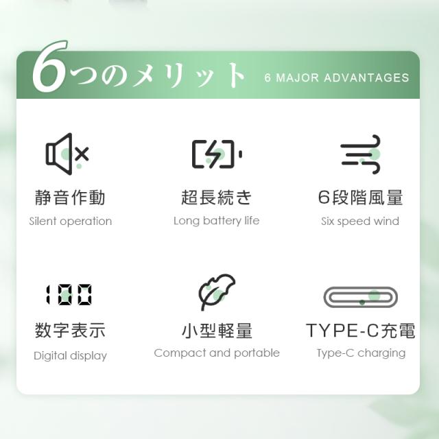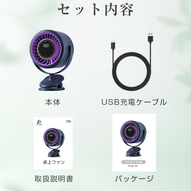 【パッケージ内容】扇風機本体、Type-C充電ケーブル、日本語取扱説明書。