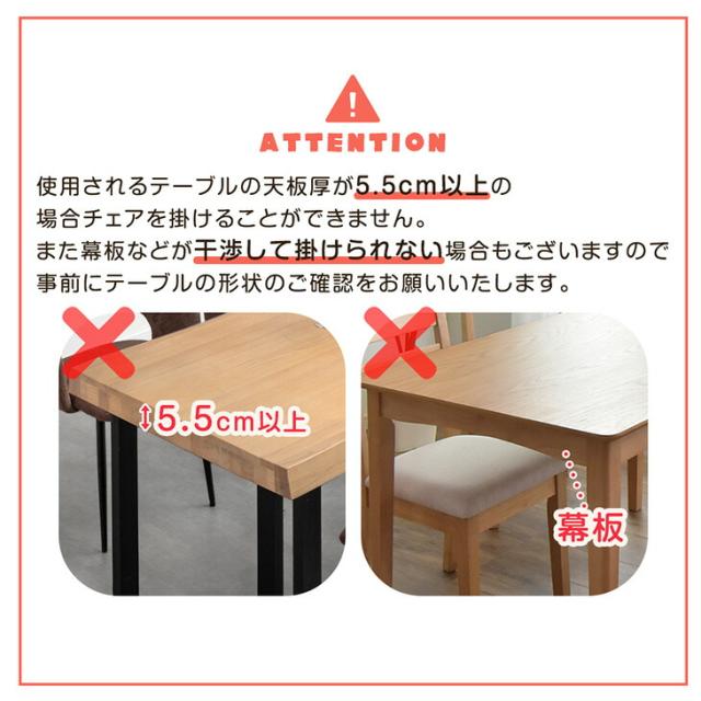 ※使用されるテーブルの天板厚が5.5cm以上の場合チェアを掛けることができません。また幕板などが干渉して掛けられない場合もございますので、事前にテーブルの形状のご確認をお願いいたします。。