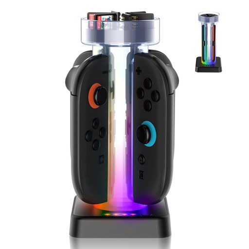 【3.5 時間急速充電】公式 AC アダプターを使用すると、最速の充電速度を実現します。入力電圧は 5V/2A で、最大 4 台の充電対象を約 3.5 時間で同時に急速充電することができます。従来品よりも充電スピードが 1.5 倍向上しています。※使用する充電環境によって、多少のばらつきがあります。充電と収納が一体化されており、充電対象を充電するだけでなく、ジョイスティック部分を収納するスタンドとしても利用できます。