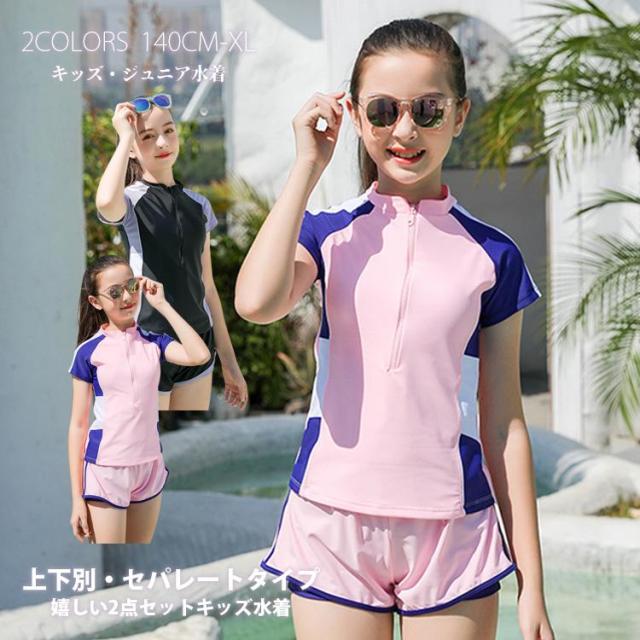 水着 女の子 キッズ スクール水着 半袖 ガールズ 女児 セット スイムウェア セパレート パンツ ジュニア 小学生 中学生 授業 オススメ ブラック 140 150 160 170