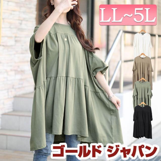 春新作 大きいサイズ レディース チュニック ビックティアードチュニックTシャツ Tシャツ カットソー ロング ティアード ギャザー Aライン ドルマン ストレッチ ゆったり 春服 夏服 秋服 LL 2L 3L 4L 5L ブラック 黒 オフホワイト 白 カーキ グレージュ ゴールドジャパン