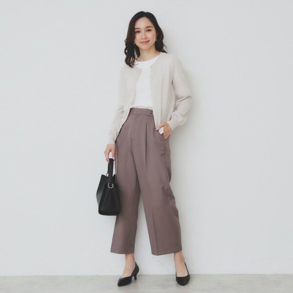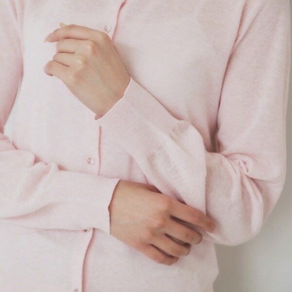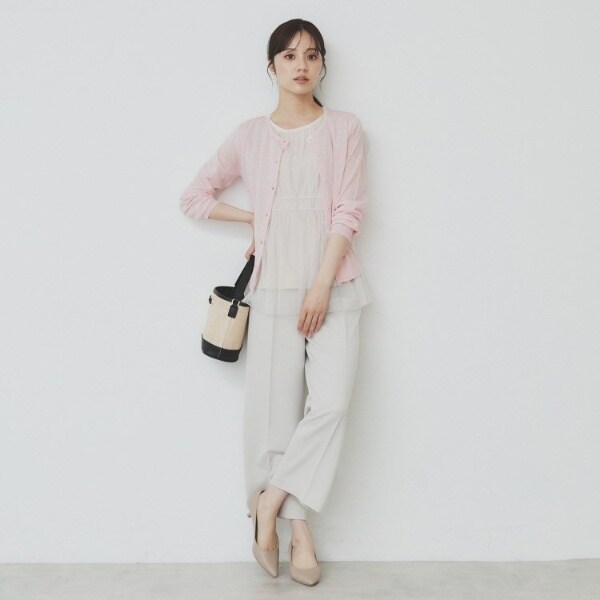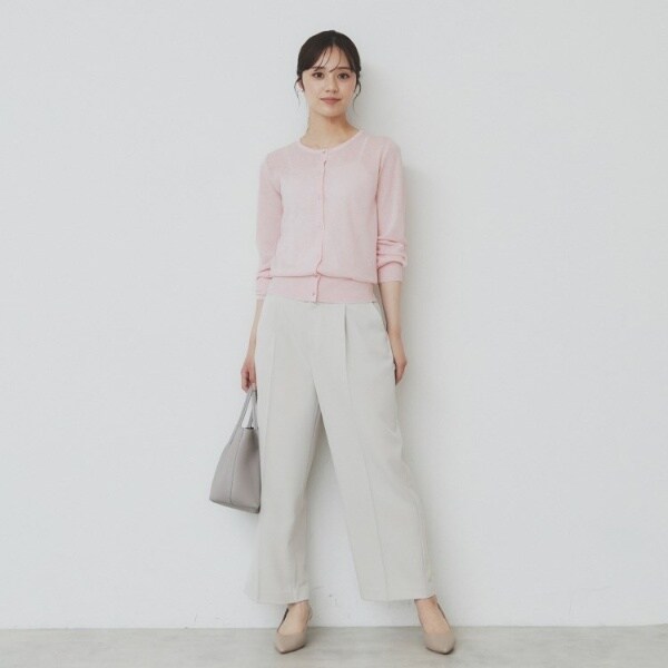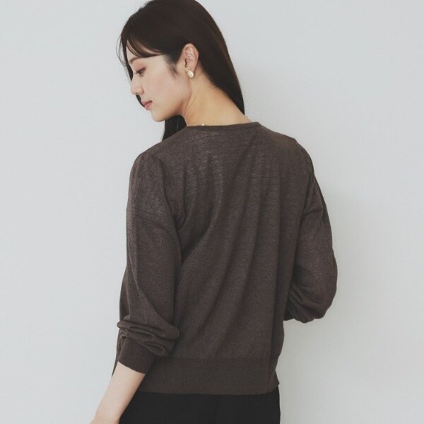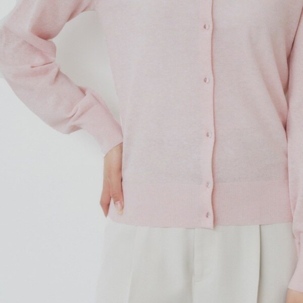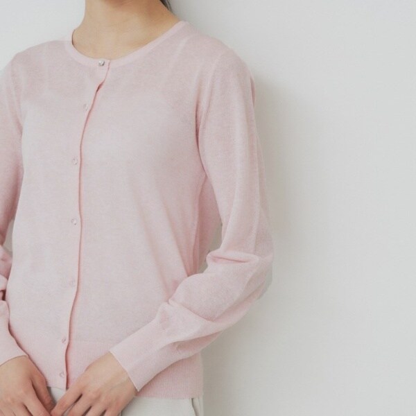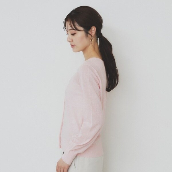 ・第一ボタンのクリスタルボタンと、クリアボタンが特徴のクルーネックカーディガン。