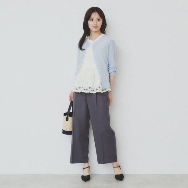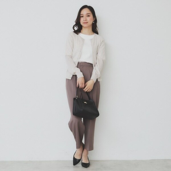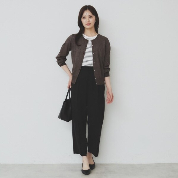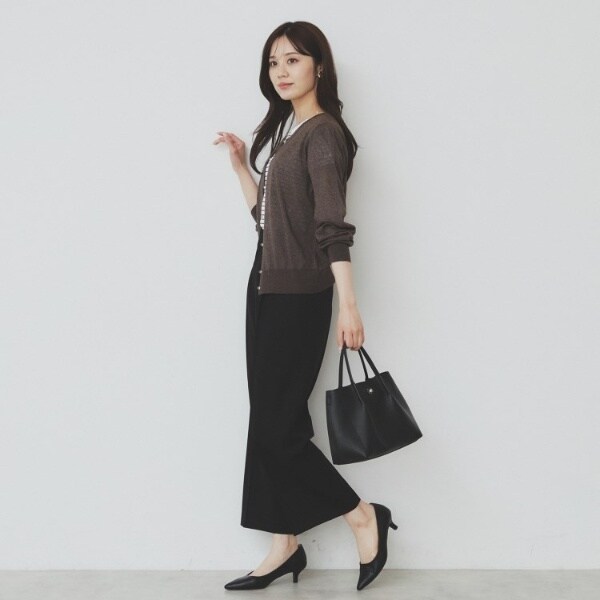 ・全ての釦を閉めてプルオーバー風に着こなすこともでき、上品な印象を演出。