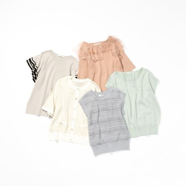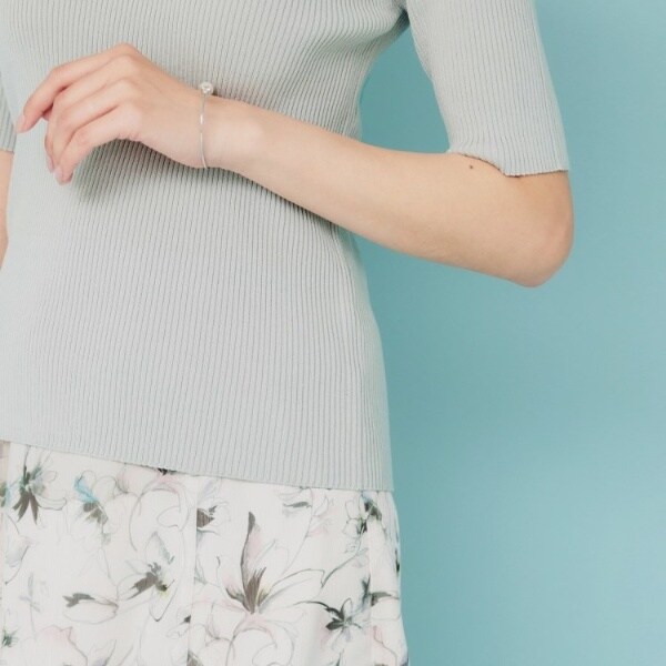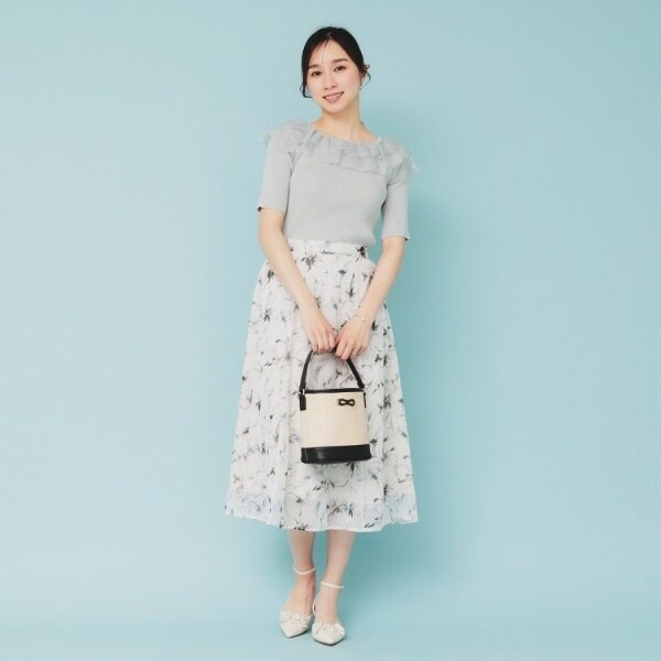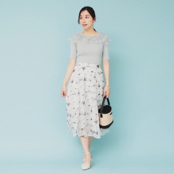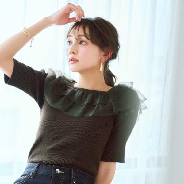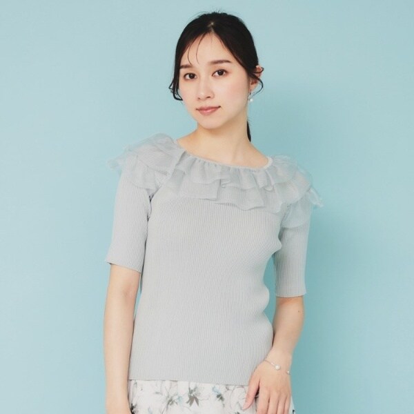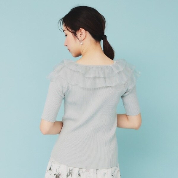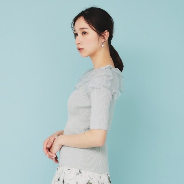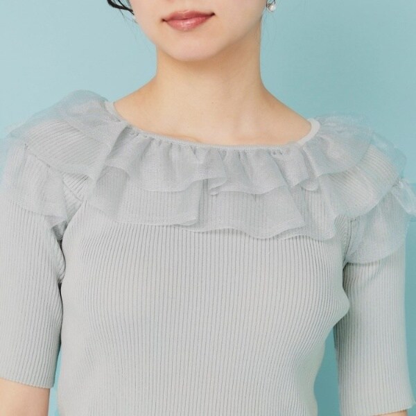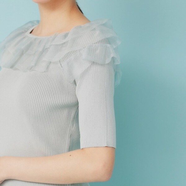 すっきりとしたスクエアネックにシアーフリルがレイヤードされたデザインニット