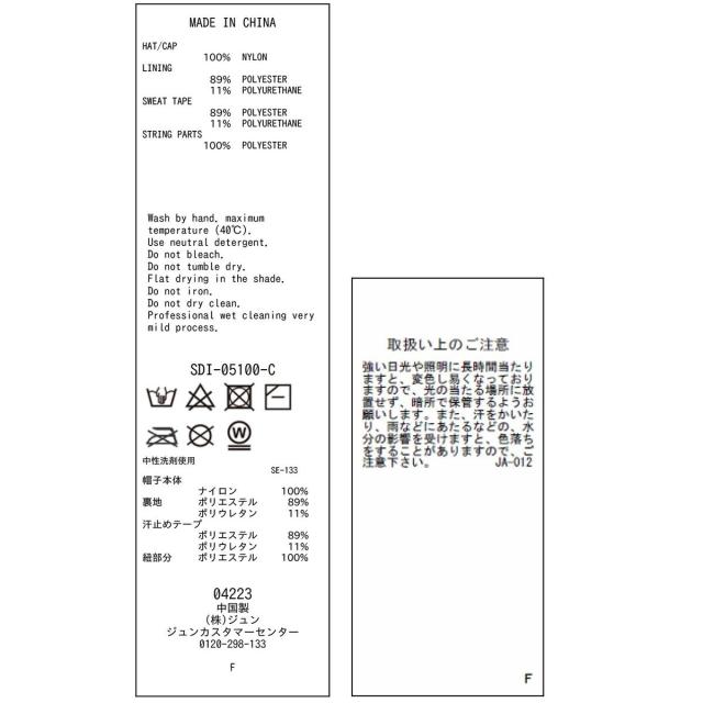 ■素材:(帽子本体) ナイロン 100% (裏地) ナイロン 89% ポリウレタン 11% (汗止めテープ) ナイロン 89% ポリウレタン 11% (紐部分) ポリエステル 100%