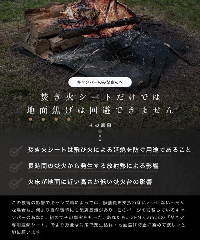 ・防火服にも使用される放射熱を反射するたアルミ素材をガラス繊維シートの上に重ね、地面を焚き火台からの熱から守ります。ガラス繊維のみで作られた焚き火シートでは飛び火から地面の延焼を防止しますが、遮熱効果を期待できないため、遮熱シートと焚き火シートをセットでお使い頂くことを推奨します。