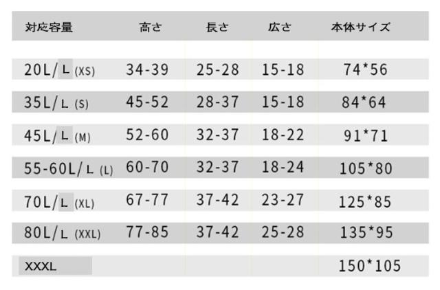 | サイズについての説明 | XS(対応容量15-25L) S(対応容量30-40L) M(対応容量40-50L) L(対応容量55-65L) XL(対応容量65-75L) XXL(対応容量75-85L) XXXL(対応容量90-100L) ※商品のサイズは手作業で測定させて頂いておりますので、若干の誤差があります。 |