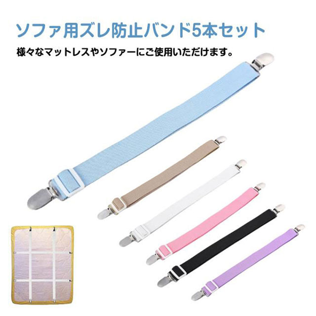 | ソファ用ズレ防止バンド5本セット。 マルチカバーをソファの底部から背面でしっかり固定できるサスペンダー。 ベルトはゴム製で伸縮性があり、金具で長さ調節も可能。カバーのズレを防止できます。 ベルトはゴム製なので、ソファやカバーのサイズに合わせてピッタリとフィットさせ、カバーのズレを防止します。 様々なマットレスやソファーにご使用いただけます。 | |