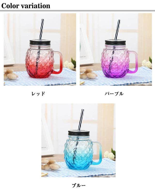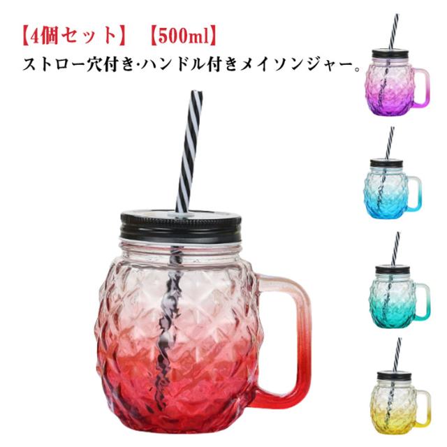 4個セット メイソンジャー 取っ手付き 500ml ドリンクボトル グラス 蓋付き ストロー タンブラー 透明 マグ カップ ガラス マグカップ クリアカップ ドリンク 飲み物 ジュース スムージー タピオカ 飲食店 カフェ グラス 北欧