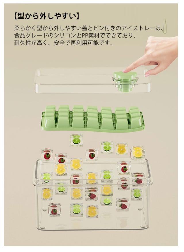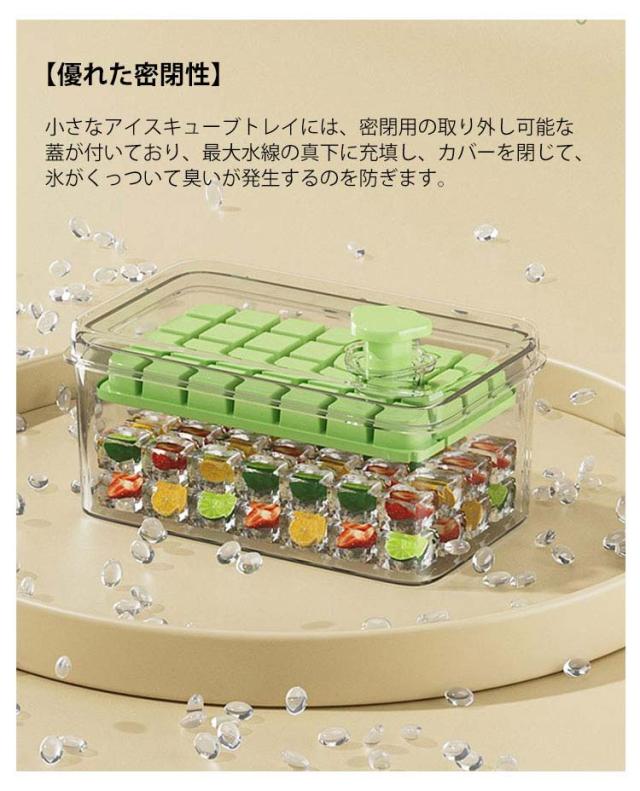 | 夏の暑さを快適に乗り切るための必需品、製氷皿です 【優れた密閉性】 小さなアイスキューブトレイには、密閉用の取り外し可能な蓋が付いており、最大水線の真下に充填し、カバーを閉じて、氷がくっついて臭いが発生するのを防ぎます。 ? 【省スペース】 積み重ね可能なデザインが特徴のアイスキューブトレイには、蓋とビンが付いており、より多くのアイスキューブを収納できる大きなビンが付属しており、キッチンや冷凍庫のスペースを節約するのに最適です。 ? 【型から外しやすい】 柔らかく型から外しやすい蓋とビン付きのアイストレーは、食品グレードのシリコンとPP素材でできており、耐久性が高く、安全で再利用可能です。 ? 【幅広い用途】 家庭やバーでの使用に最適なシリコンアイスキューブトレイは、ウィスキー、カクテル、コーヒー、その他のミックスドリンクに最適で、ジュース、ヨーグルト、フルーツ、その他の好きな食べ物を加えることができます。 | |