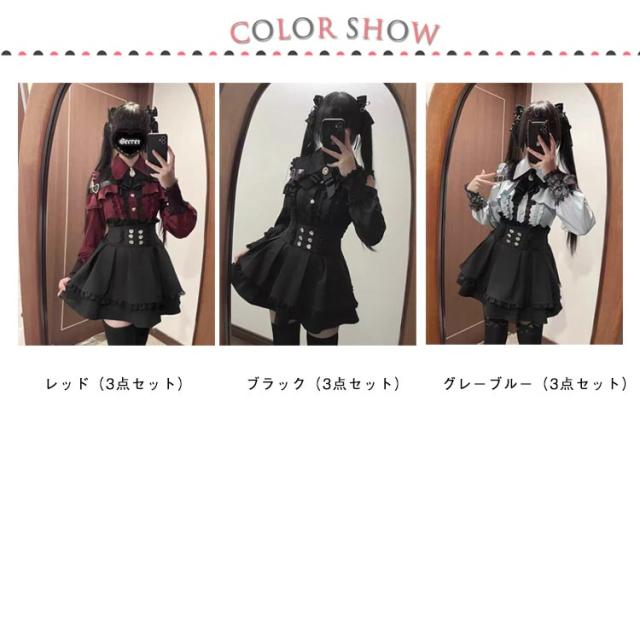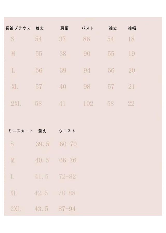 | サイズについての説明 | 3点セット:「長袖ブラウス」+「ミニスカート」+「リボンブローチ」の3点セットです。 |