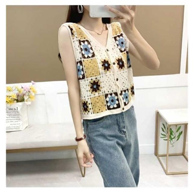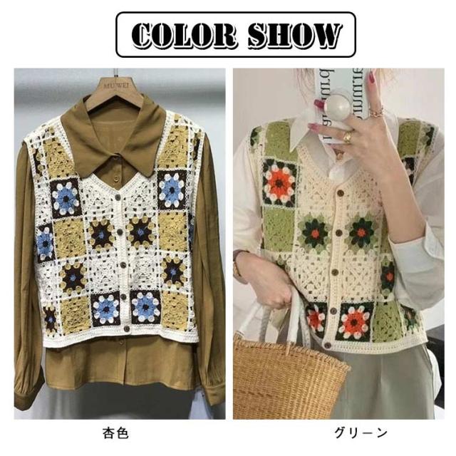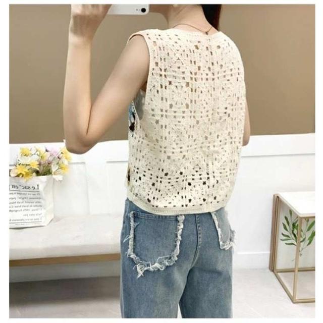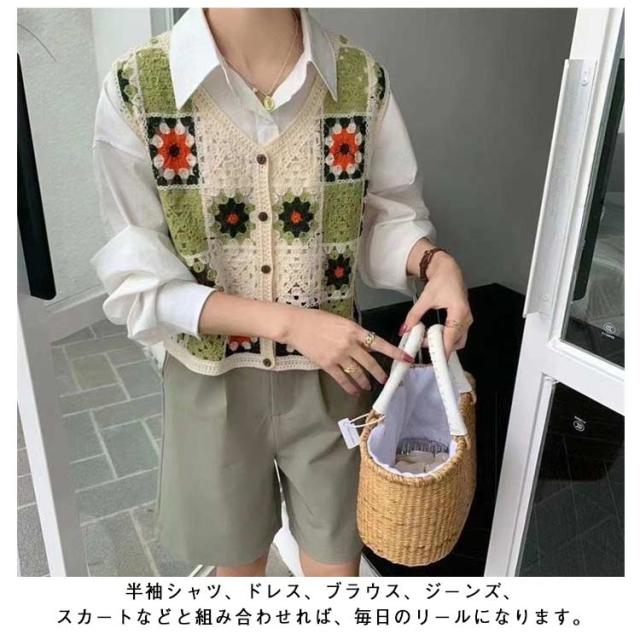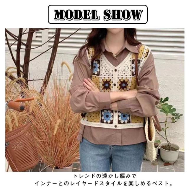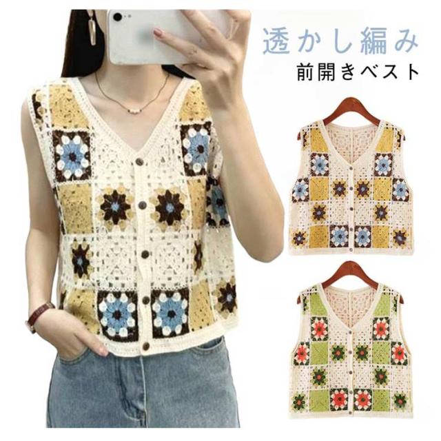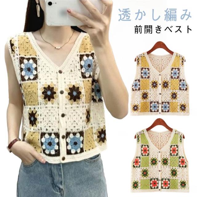かぎ針 かぎ編み 無地 ニット ベスト 前開き 前開きベスト レディース 柄 透かし編み ベスト ジレ ニットベスト サマーニット 袖なし 薄手 体型カバー 大きいサイズ レイヤード ゆったり シンプル きれいめ 重ね着 春物 夏物 20代 30代