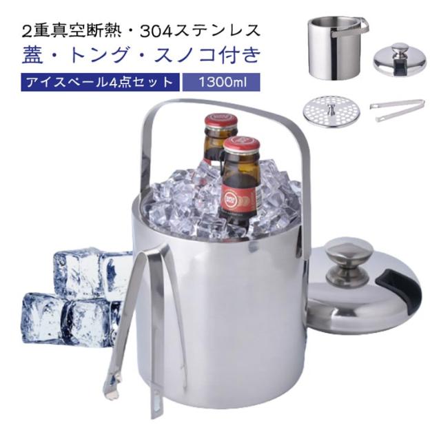 保冷 セット トング ステンレス 4点セット 小型 スノコ付き 蓋 おしゃれ 真空断熱 魔法瓶 ワインクーラー 1.3L 二重構造 1.3リットル 溶けない 氷 1.3L コンパクト アイスバケット 持ちやすい ウイスキー
