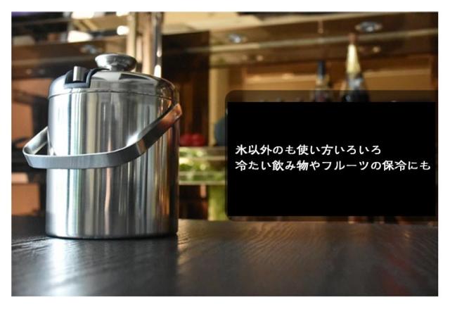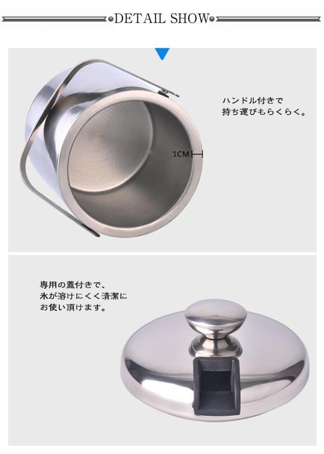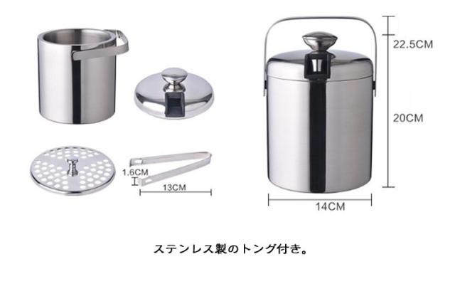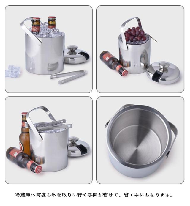 | 2重真空断熱・304ステンレス 蓋・トング・スノコ付き アイスペール4点セット 1300ml 魔法瓶構造で氷が長持ち スポーツやアウトドアに最適! 家飲みやホームパーティーにピッタリの容量1.3Lの氷入れ。 熱を逃げにくい 断熱2重構造 304ステンレス/最大6時間保冷 外気の影響を受けにくくアウトドアシーンに最適な2重真空断熱構造 氷以外のも使い方いろいろ 冷たい飲み物やフルーツの保冷にも ステンレス製のトング付き。 氷を溶けにくくするための専用スノコが付いています。 ハンドル付きで持ち運びもらくらく。 専用の蓋付きで、氷が溶けにくく清潔にお使い頂けます。 冷蔵庫へ何度も氷を取りに行く手間が省けて、省エネにもなります。 <お勧めポイント> ●コンパクト 持ち手が付いていて、持ち運び楽々 ●高い保冷性 密封性高い蓋付き 冷気を外に逃さない ●こだわりの機能性 耐候性にも優れ、ほとんど経年劣化しません。 | |