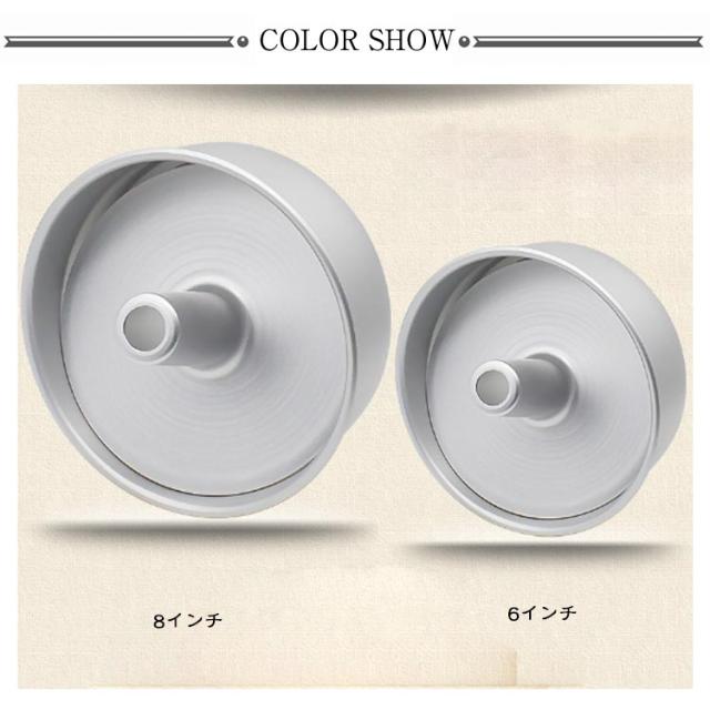 | 6インチ!8インチ! アルミ製で熱伝導がよく、熱ムラがなくふっくらきれいに仕上がります。 煙突部分につなぎ目がなく離型もお手入れも簡単! 底板は取り外し可能なので生地を外しやすいです。 | |