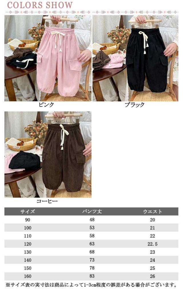| 80〜160cm!ワイドなシルエットが印象的なコーデュロイパンツです。 優しい色味のカラーは、ブラウスやトレーナー、パーカーなど、 いろんなテイストのトップスとコーディネートしやすく着回し力抜群! すっきりとした幅広のシルエットは大人っぽい印象です。 | |