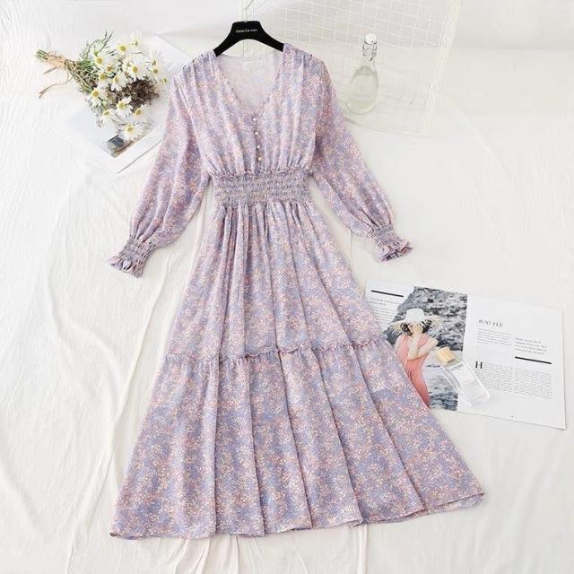 ウエストシャーリング花柄ロングワンピース 長袖 秋 ワンピース タイムセール送料無料 可愛い花柄