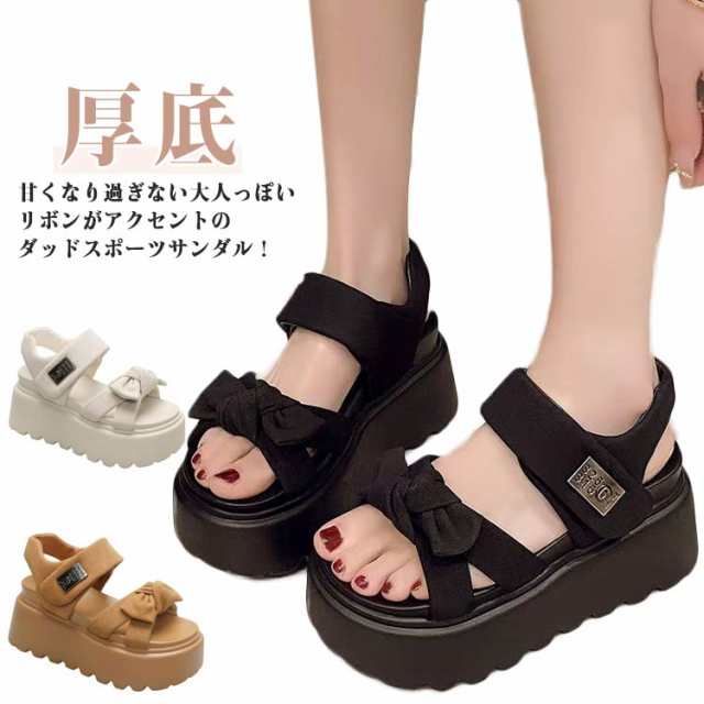 厚底 リボン リボン サンダル スポーツサンダル ダッドスポーツサンダル 厚底サンダル レディース ダッドスポーツサンダル ベルクロ 厚底 ストラップ フェミニン 旅行 レジャー アウトドア 浴衣 サンダル 韓国ファッション