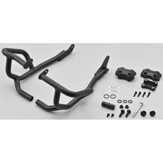 不慮の転倒の際、ライダーや愛車へのダメージを軽減させるエンジンガード。マフラーの脱着が不要で取り付けができます。