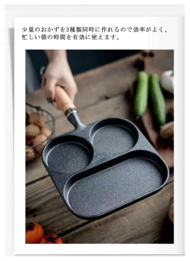 商品説明 仕切りフライパン IH対応 ガス火 直火 鉄器 鋳物 鉄製品 フライパン 目玉焼き 玉子焼き器 卵焼き器 仕切り付きフライパン 木柄付 3穴 鉄